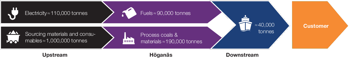 Illustration of the ‘cradle to gate’ scope for Höganäs climate initiative and roadmap. As indicated by the data, materials sourcing is the largest contribution of emissions of carbon dioxide.
